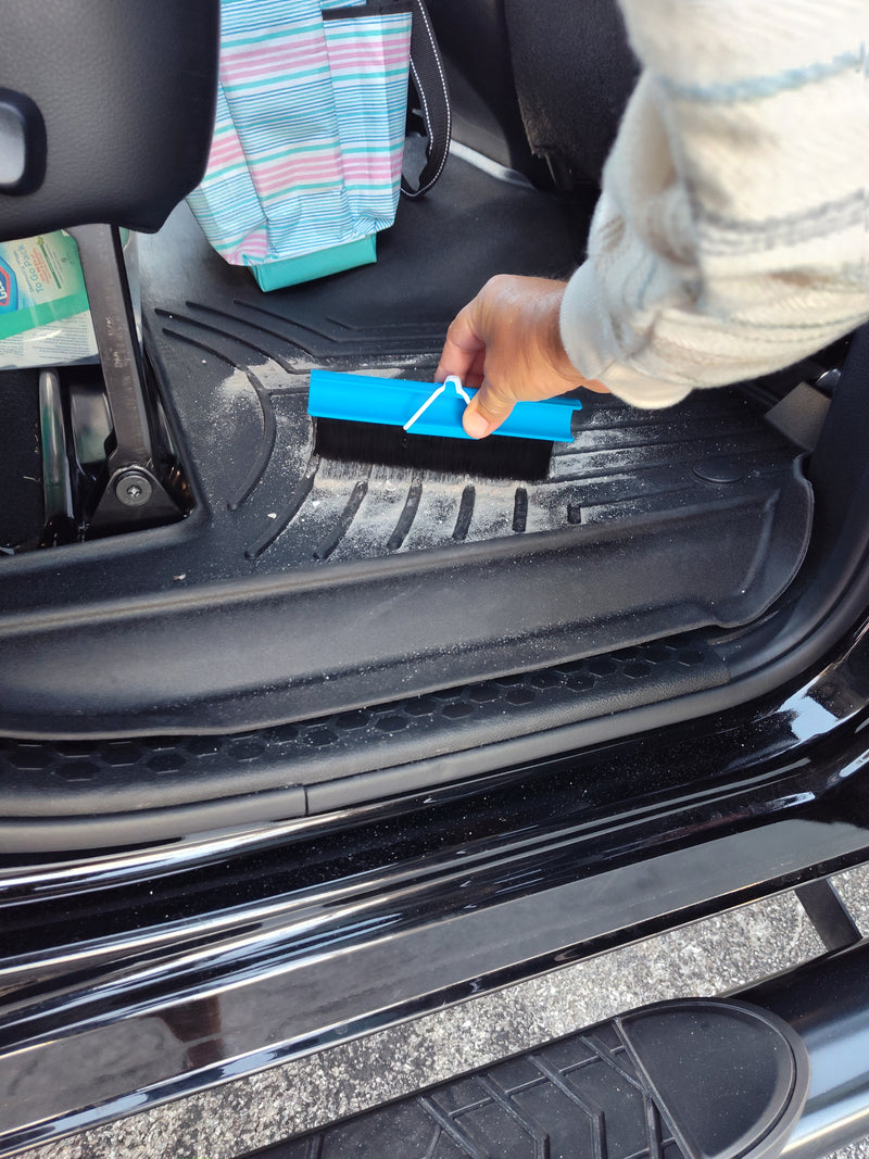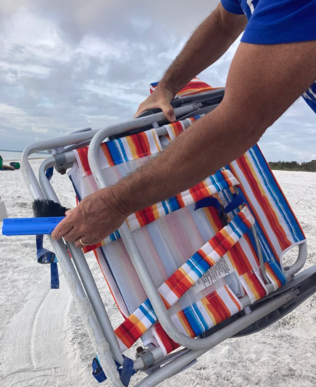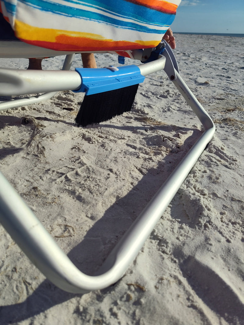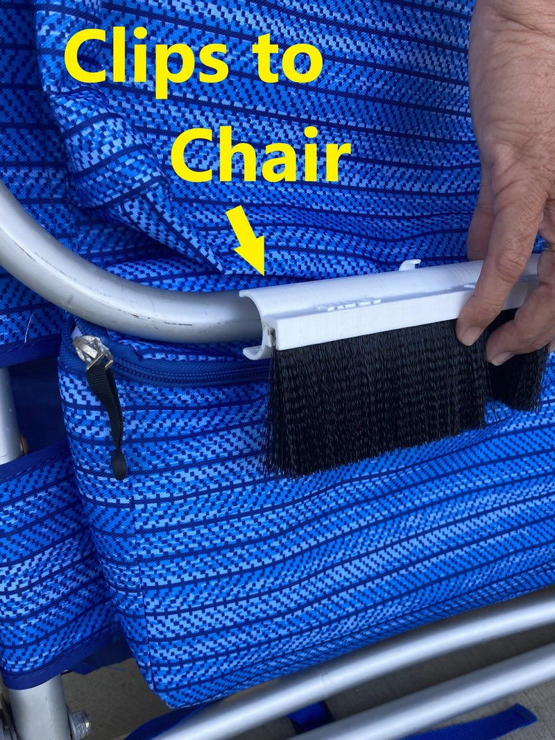 The Tidey Beach Brush clips to your chair so you can remove sand in seconds—no mess, no hassle.