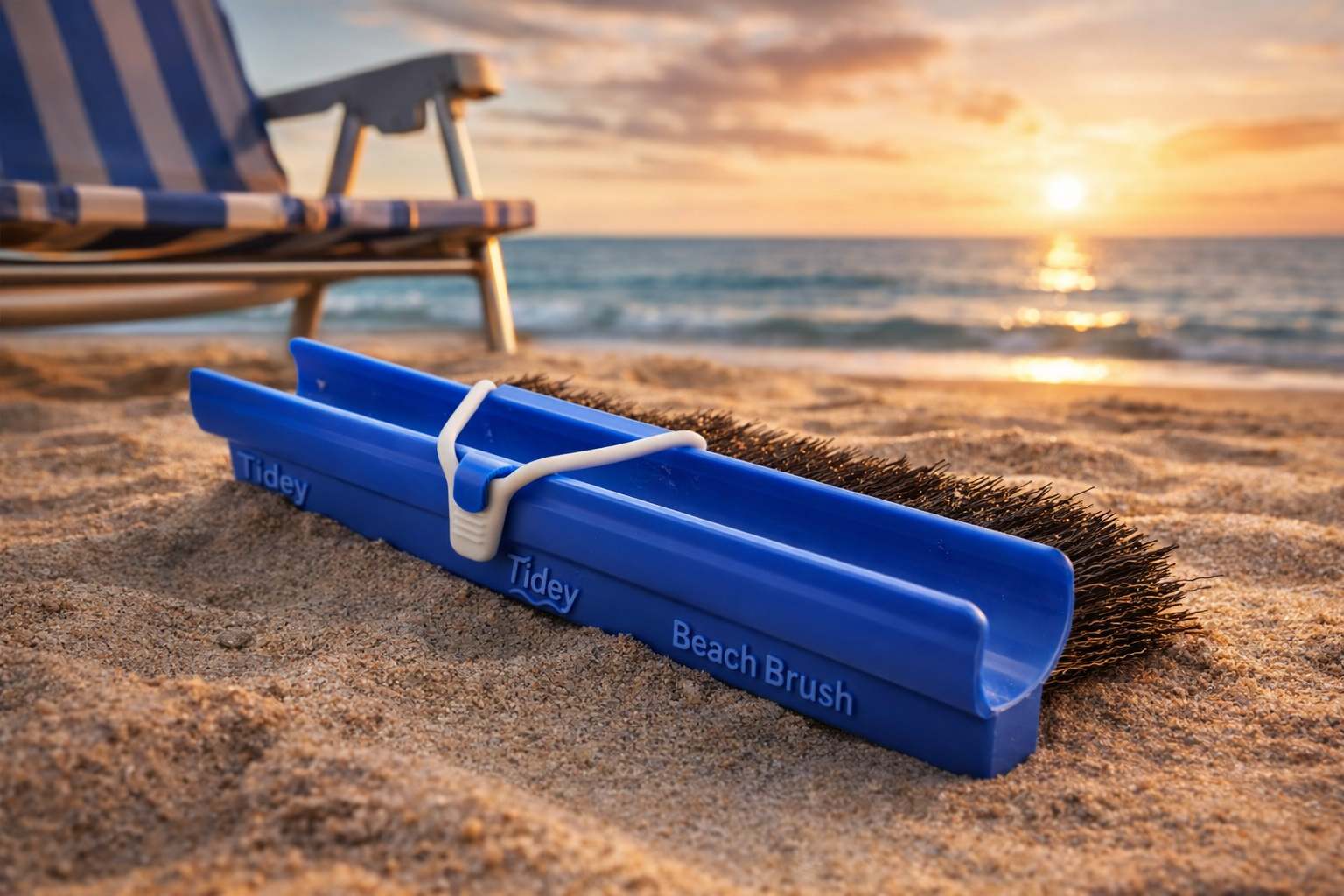 The Tidey Beach Brush is your ultimate beach companion. Its secure clip ensures it stays attached to your chair, ready to use whenever you need it.